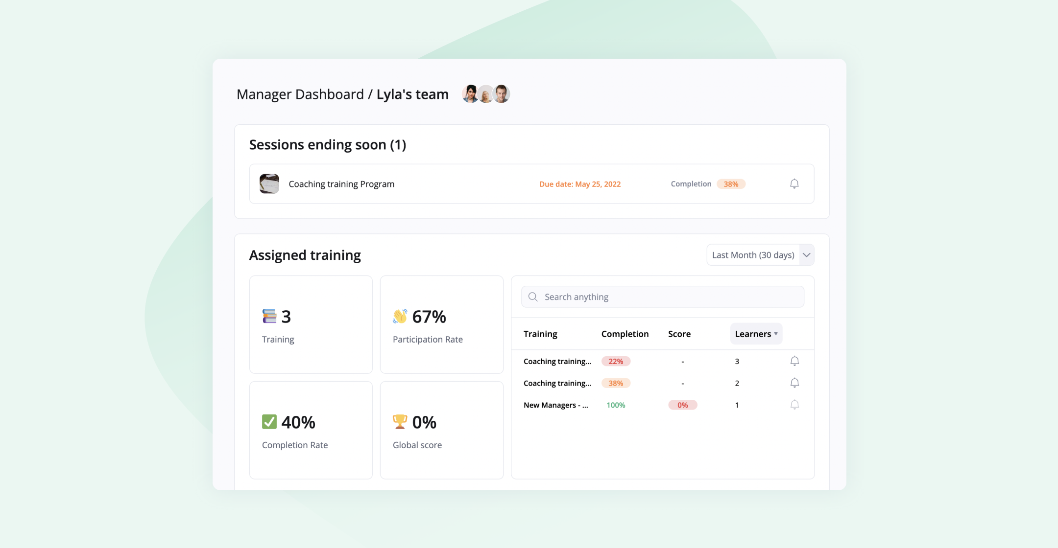 Managing L&D engagement and progress by team is easier than ever with 360Learning. With the latest enhancements to our Manager Dashboard, managers can view the performance of their direct reports and their direct reports' teams. Performance metrics, like participation and completion rates, enrolled training and scores, can be viewed in aggregate by team or by individual user.