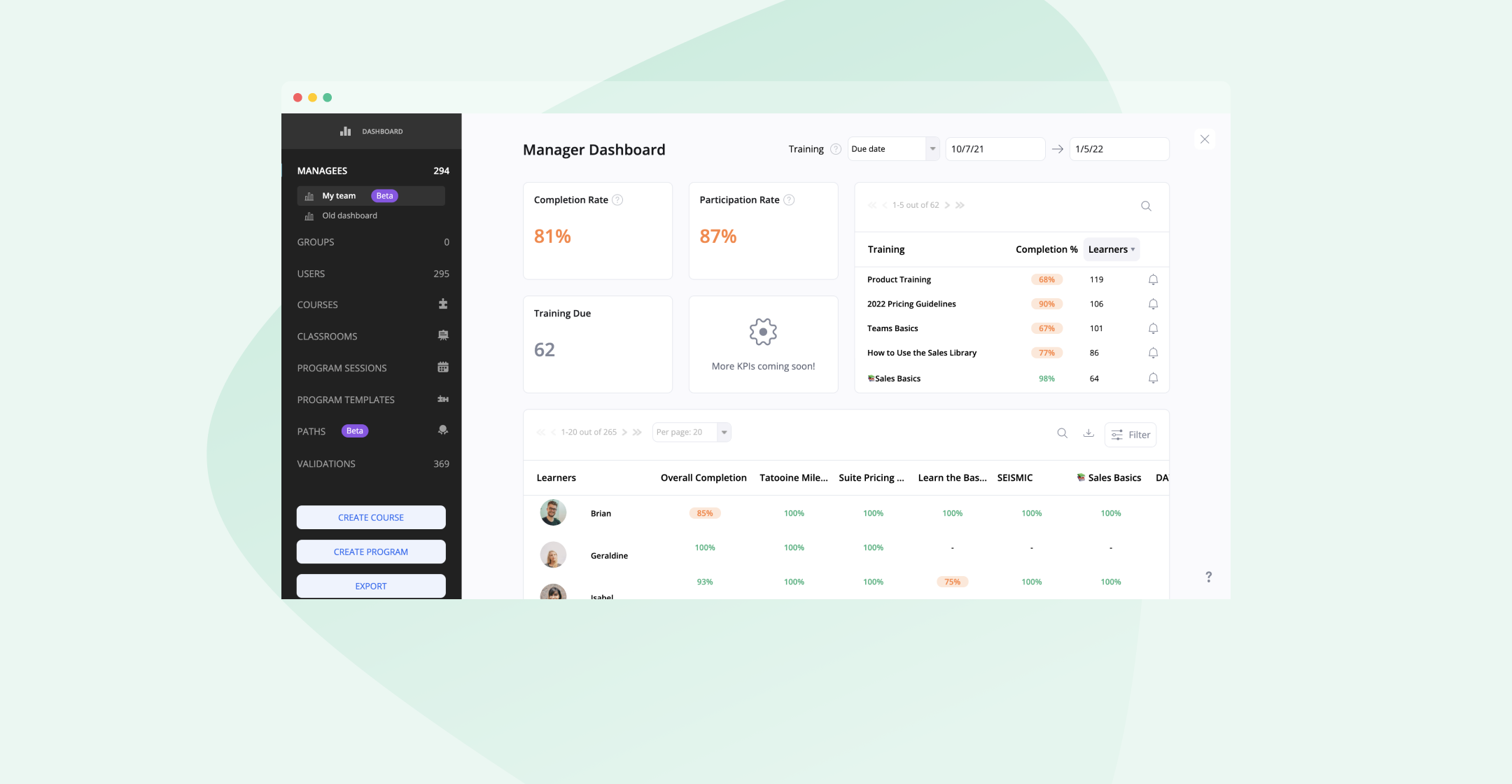 There’s no way around it: managers know their teams best. So why wouldn’t you include them in your training strategy? With our new manager dashboard, they have all the information at their fingertips to monitor the team’s progression and send training reminders.