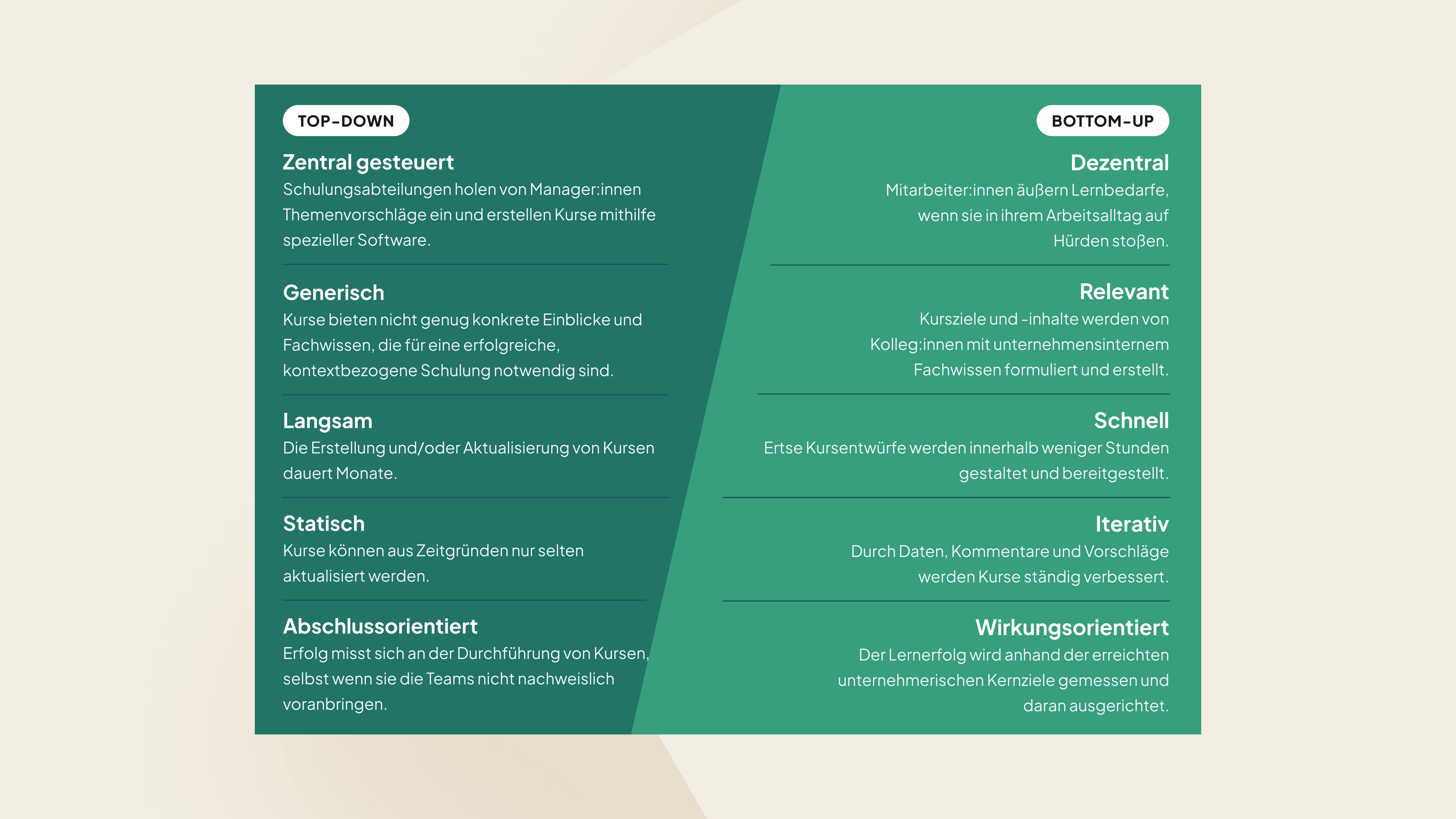 Das ist nicht nur demokratischer, sondern auch dynamischer. Es gibt Raum für Gespräche, Feedback und Überarbeitungen. Sie können effektivere Lernmaterialien erstellen und gleichzeitig Mitarbeiter:innen stärker einbinden.