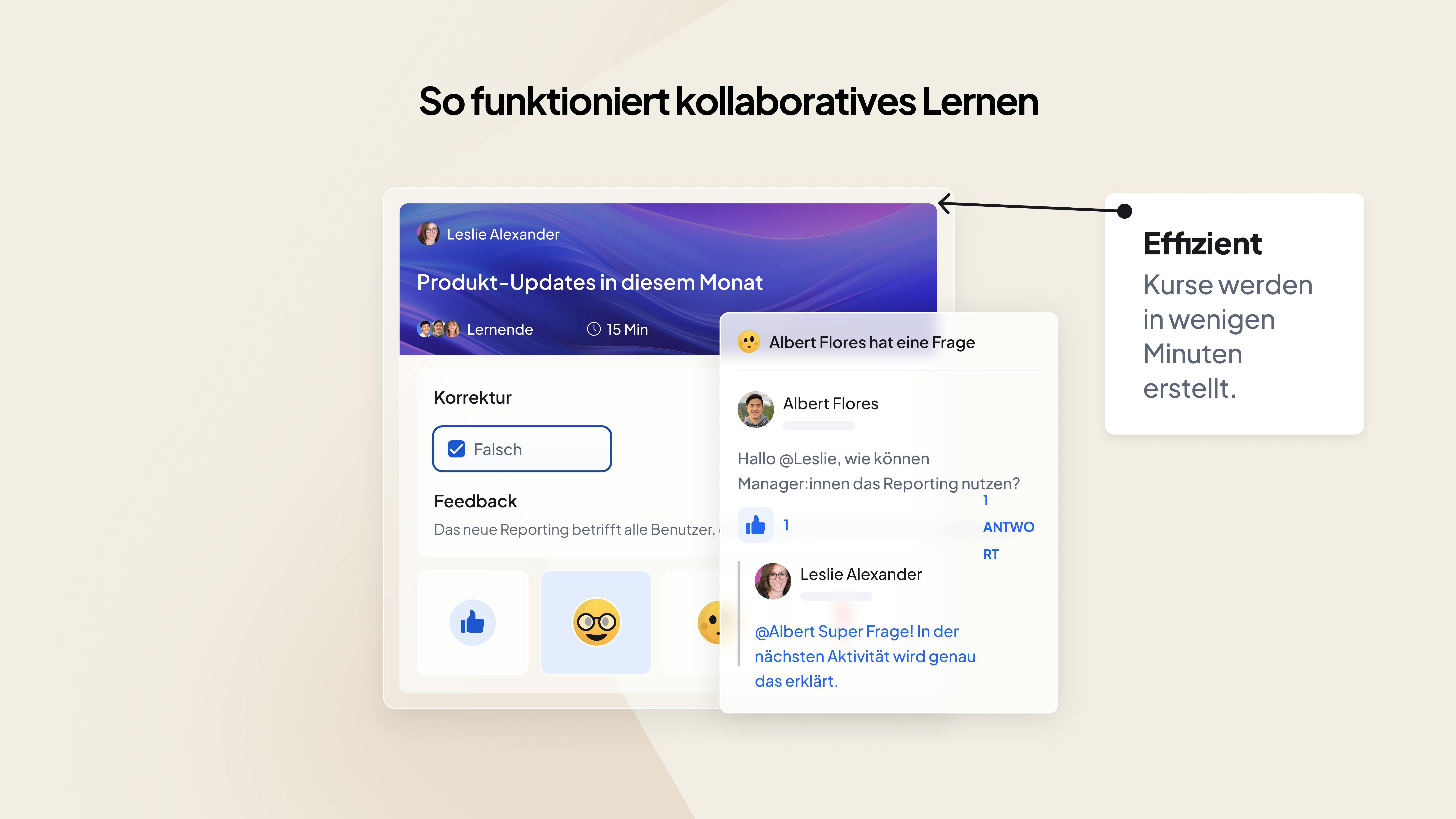 Da die Erstellung von Kursen in vielen Unternehmen ebenso langsam wie kostspielig ist, werden diese nur selten aktualisiert und erneuert. Beim Collaborative Learning liegt das Hauptaugenmerk auf der unkomplizierten Erstellung und Bearbeitung von Kursmaterialien, wodurch es viel einfacher ist, sie anhand neuer Informationen oder des Feedbacks von Mitarbeiter:innen zu aktualisieren.