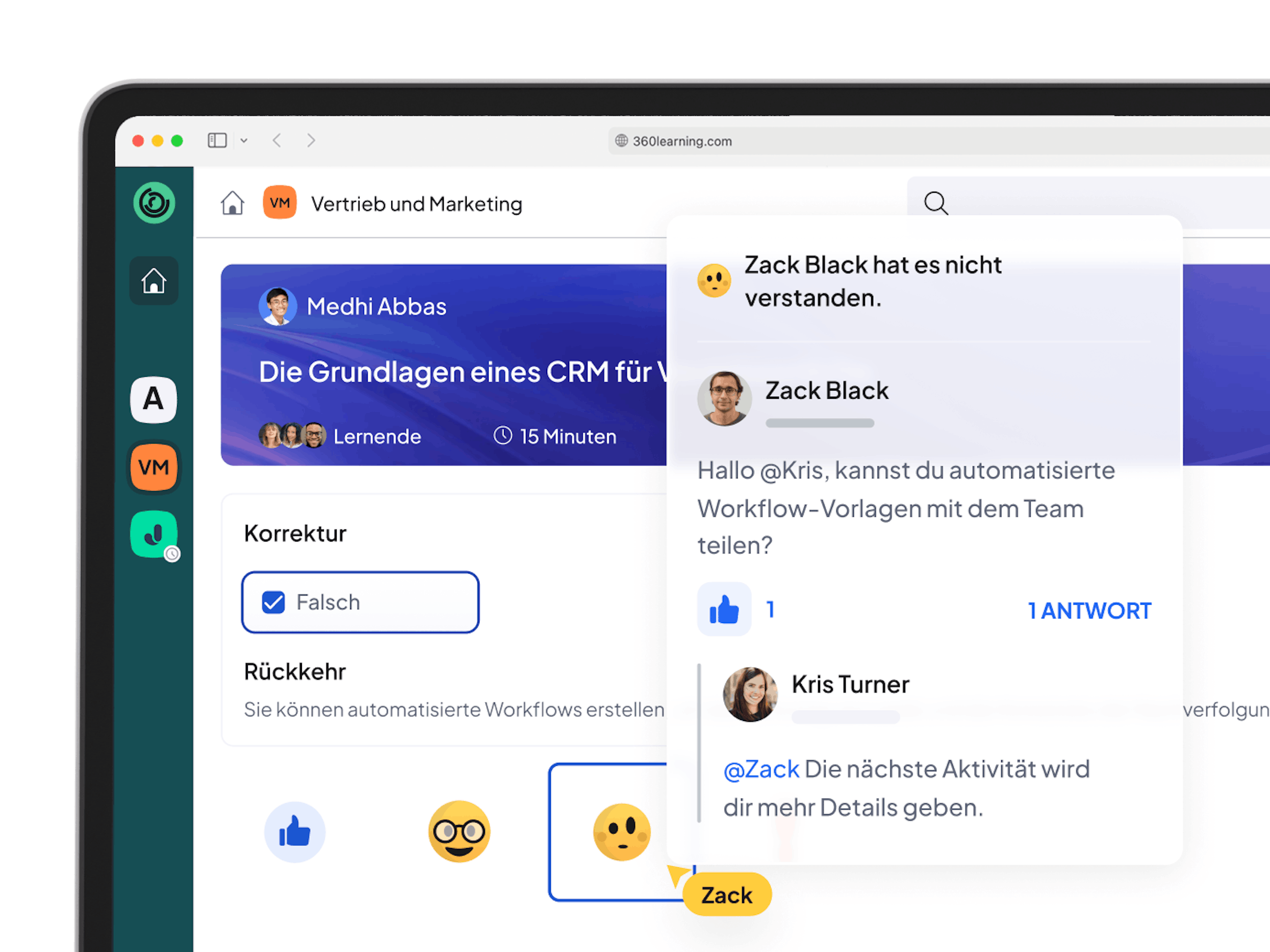 Die Abteilung Sales Enablement kann neue Produktfunktionen vorführen. Die Abteilung Customer Satisfaction kann eine Anleitung erstellen, die den Mitarbeiter:innen bei der Lösung eines wiederkehrenden Problems hilft. John aus der Buchhaltung kann das neue Verfahren zur Einreichung von Spesenabrechnungen erläutern. All diese Kurse können leicht bereitgestellt werden, und die Schulungsleiter:innen (Kursverfasser:innen) können rasch Feedback von relevanten Teilnehmer:innen erhalten, während sie die Kurse mit der Zeit überarbeiten und verbessern.