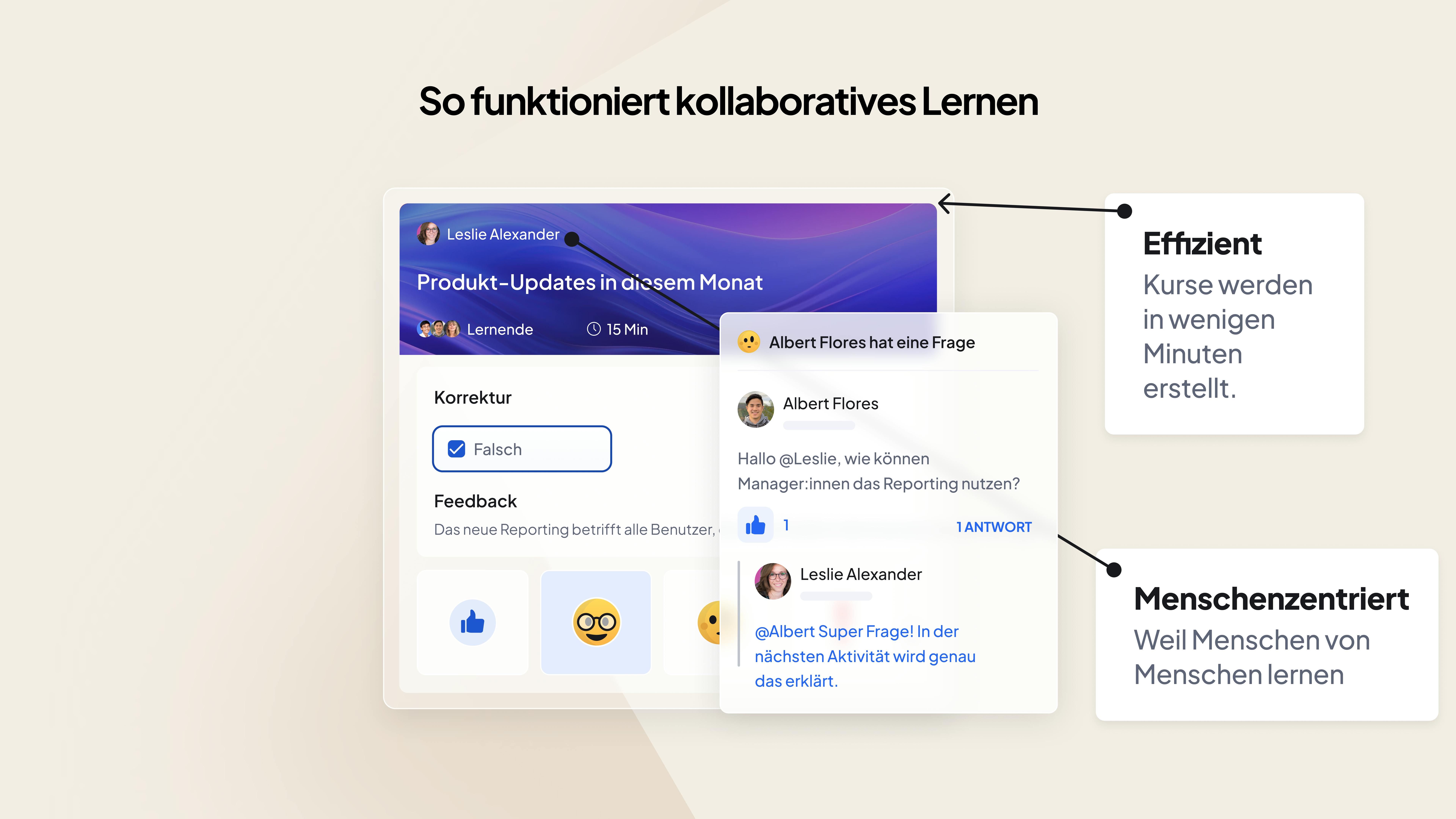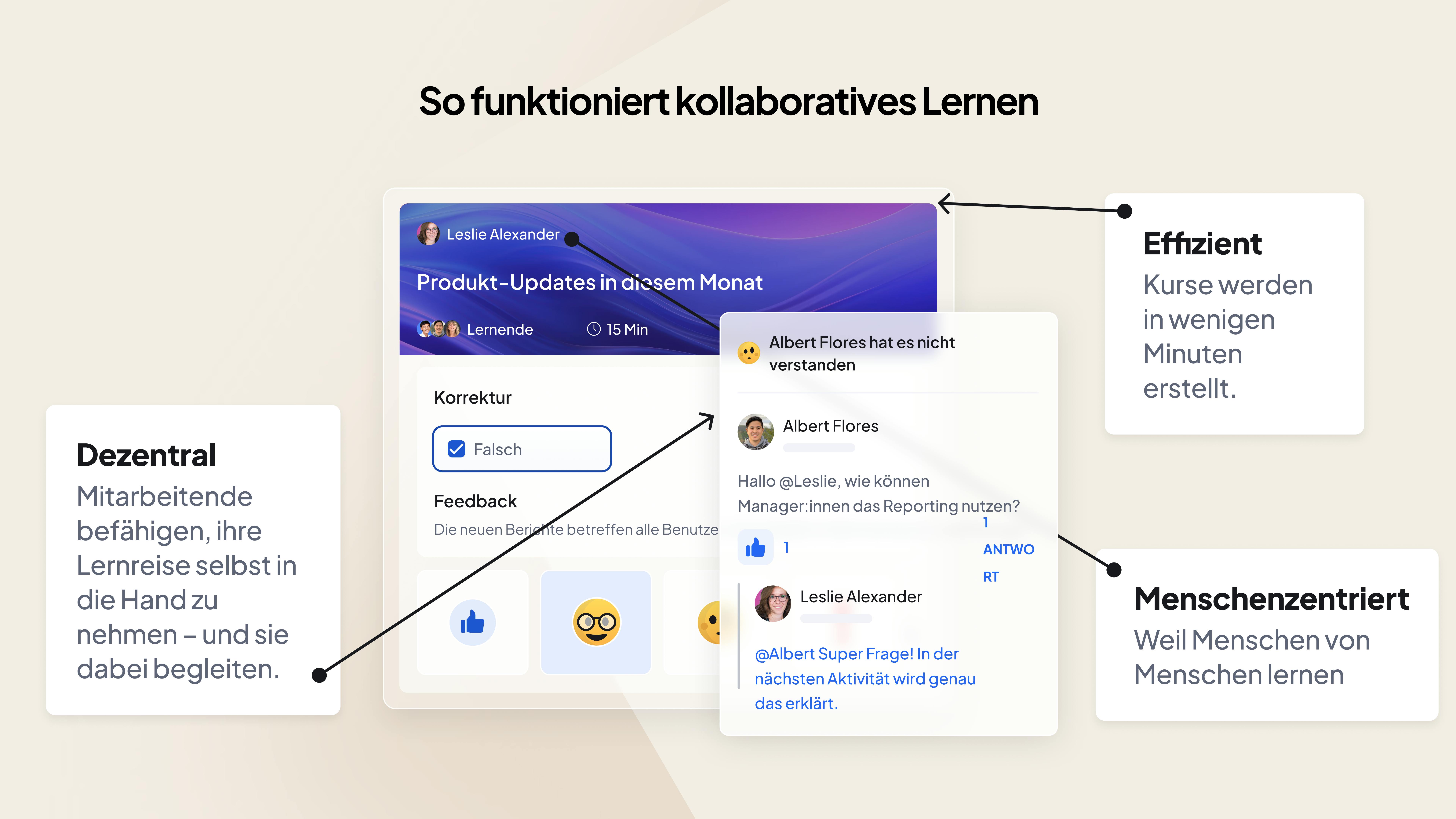 Die Mitarbeiter:innen sind die wertvollste Ressource eines Unternehmens. Eine Collaborative Learning-Plattform unterstützt Sie, diesen Wettbewerbsvorteil zu nutzen, indem Sie Teams voneinander lernen lassen, anstatt einfach standardisierte Lerninhalte auf Grundlage der jeweiligen Arbeitsfunktion vorzuschreiben.