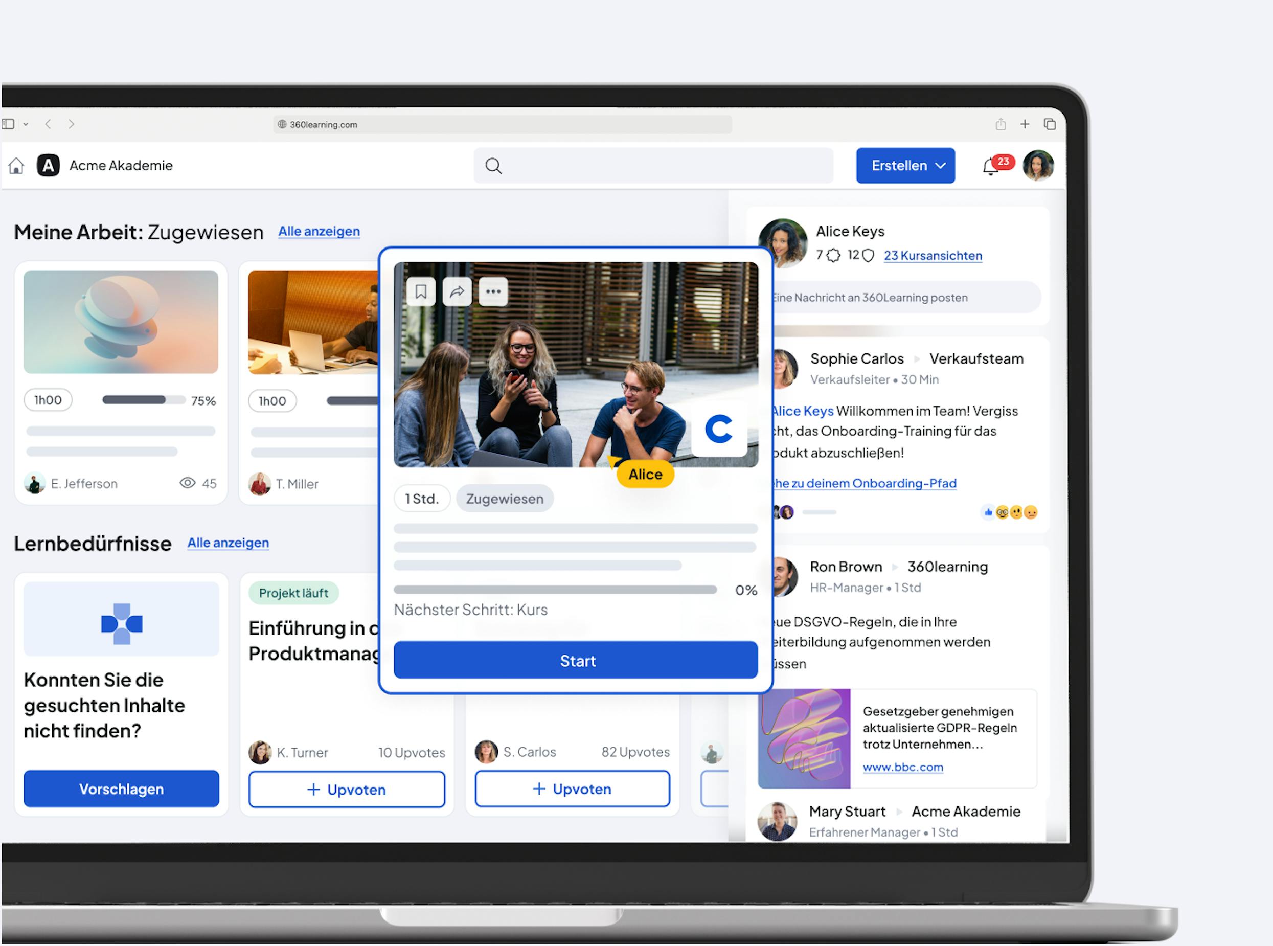 Die 360Learning Suite hilft Ihnen dabei, jeden Lernbedarf zu bewältigen, der sich mit der Zeit ergibt – sei es die Einarbeitung von Mitarbeitenden, Vertriebsschulungen, Kundenschulungen und vieles mehr.