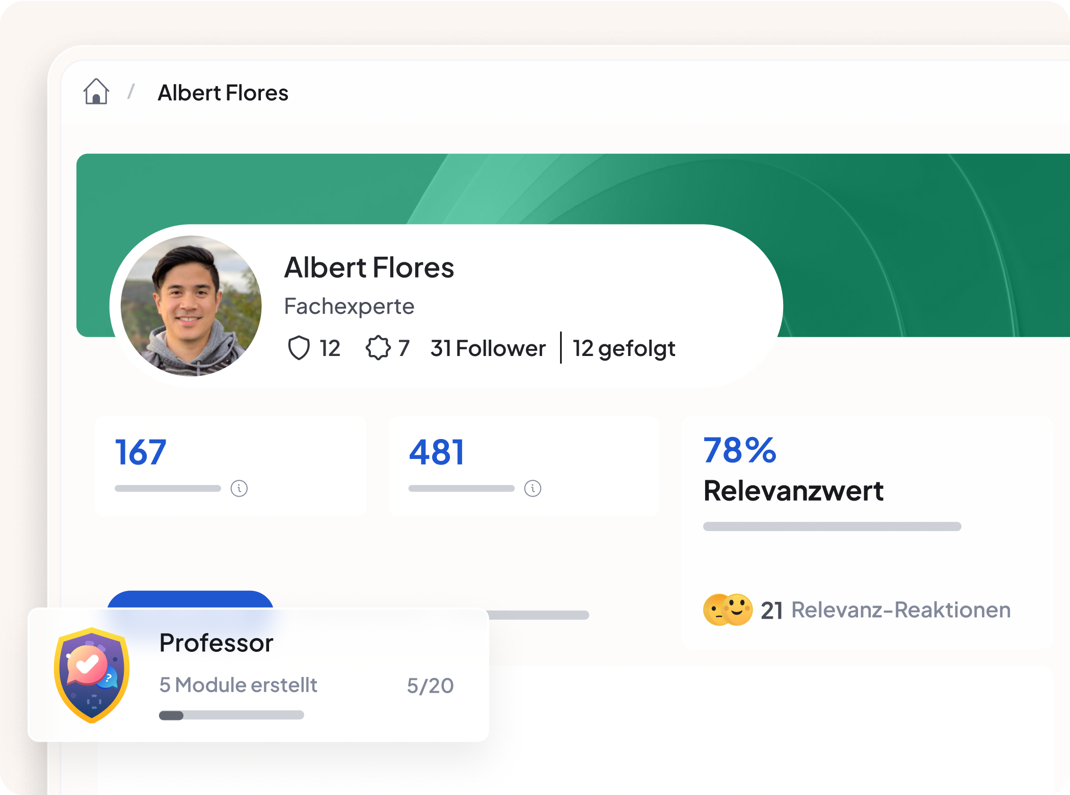 Sichtbare Abzeichen heben das Engagement der Autoren hervor. Finden Sie schnell Ihre aktivsten Kursautoren und identifizieren Sie Experten, um Wissenslücken zu schließen.