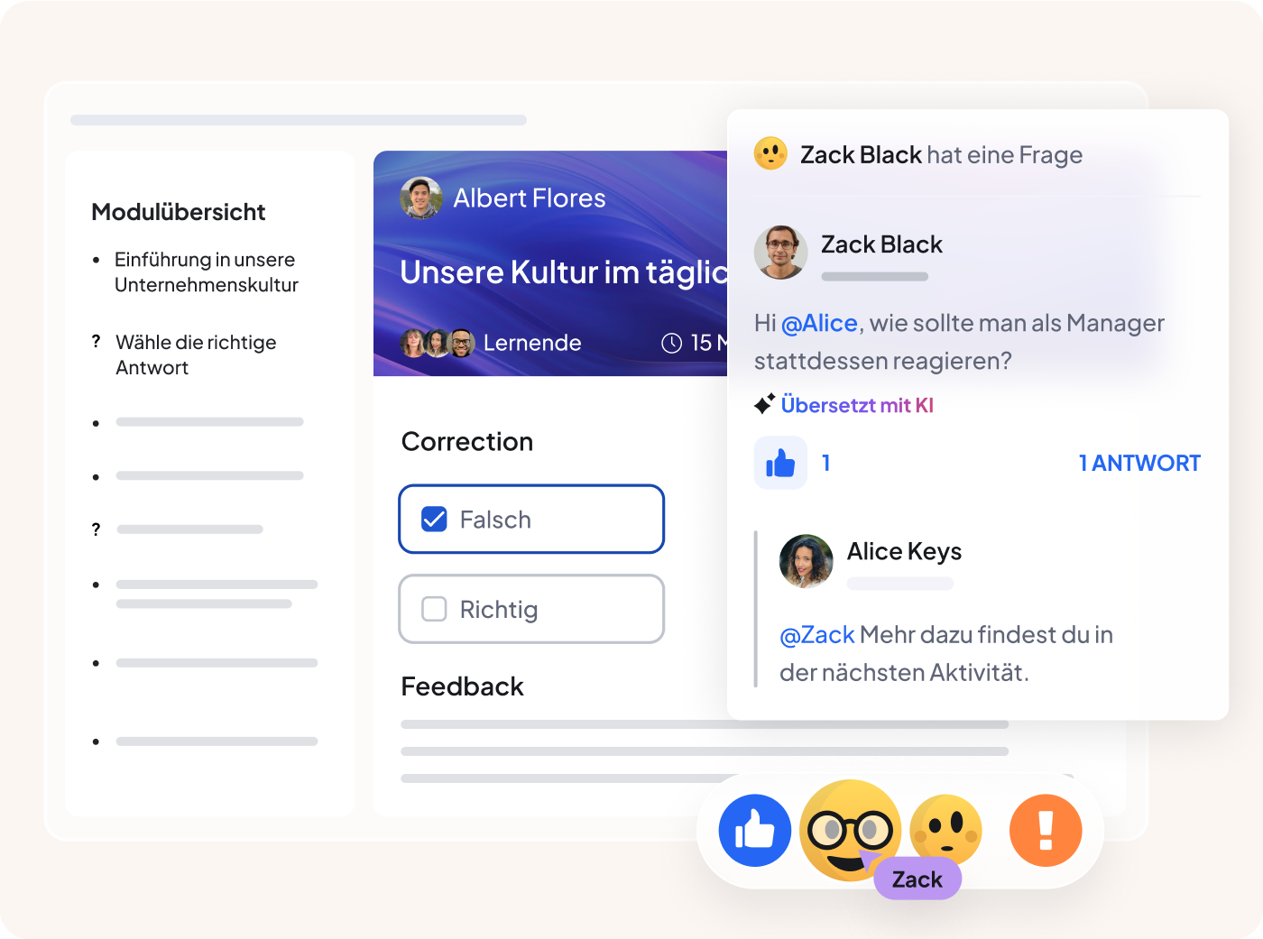 Wenn Ihre Kurse nicht relevant oder gar veraltet sind, verlieren alle. Dank Reactions der Lernenden wird kontinuierlich Feedback eingeholt.