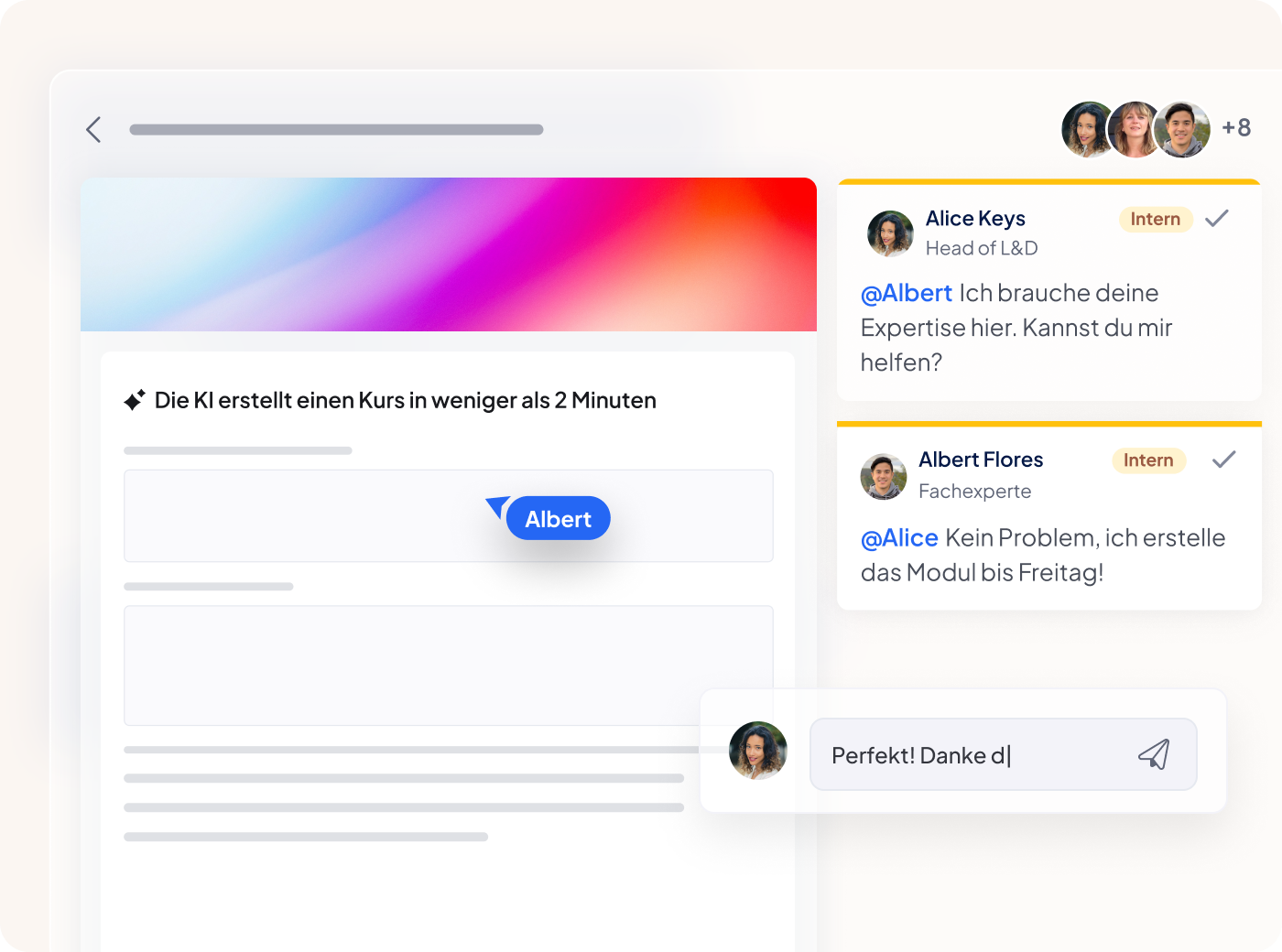 KI ermöglicht es Ihren Experten, ansprechende Schulungen zu firmeneigenen Skills zu erstellen, das Wissen im Unternehmen zu halten und die Weiterbildung zu skalieren. L&D-gesteuerte Prompts geben den Rahmen vor, während Projekt-Funktionen die Arbeitsabläufe optimieren.