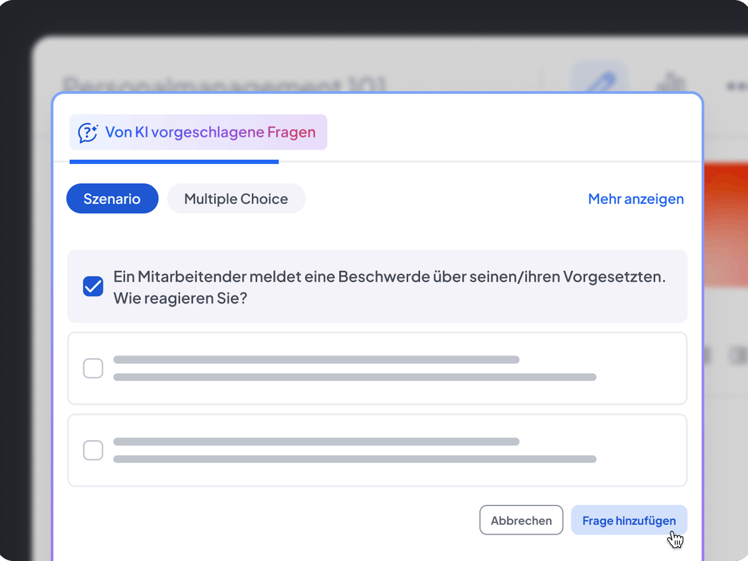 Mit KI-Unterstützung entstehen Ihre Module im Handumdrehen. Einfach ein Thema eingeben, smarte Vorschläge erhalten und ohne Schreibblockade durchstarten. Effizient und stressfrei.