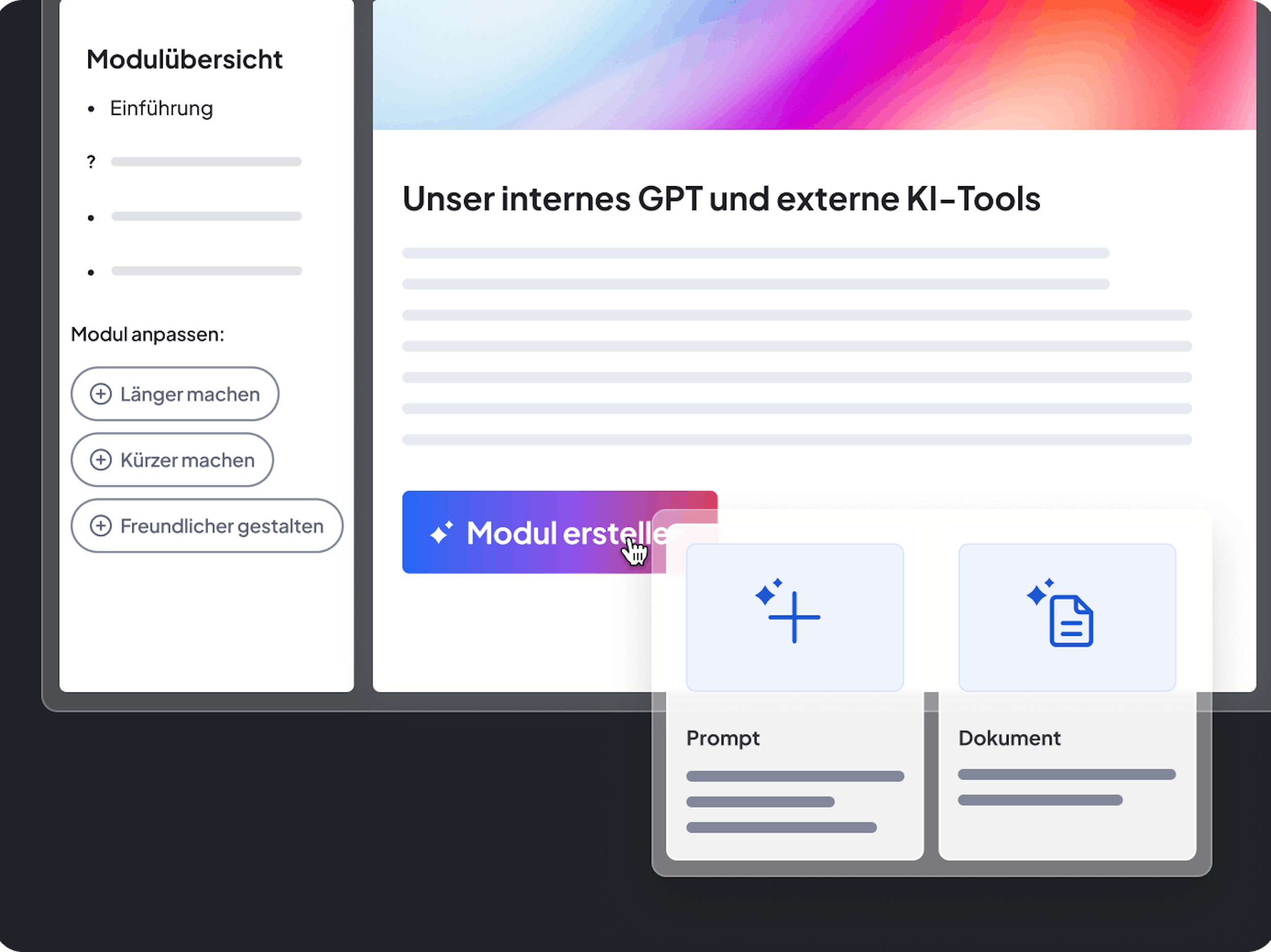 Nutzen Sie unsere KI-Funktionen, um Lerninhalte einfach zu erstellen, auf Ihre firmeninternen Richtlinien und Lernziele anzupassen und relevante Schulungen minutenschnell zu liefern.