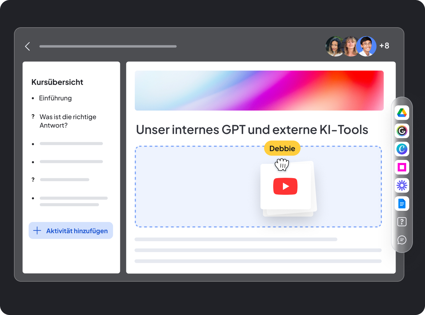 Nutzen Sie unsere KI-Funktionen, um Lerninhalte einfach zu erstellen, auf Ihre firmeninternen Richtlinien und Lernziele anzupassen und relevante Schulungen minutenschnell zu liefern.