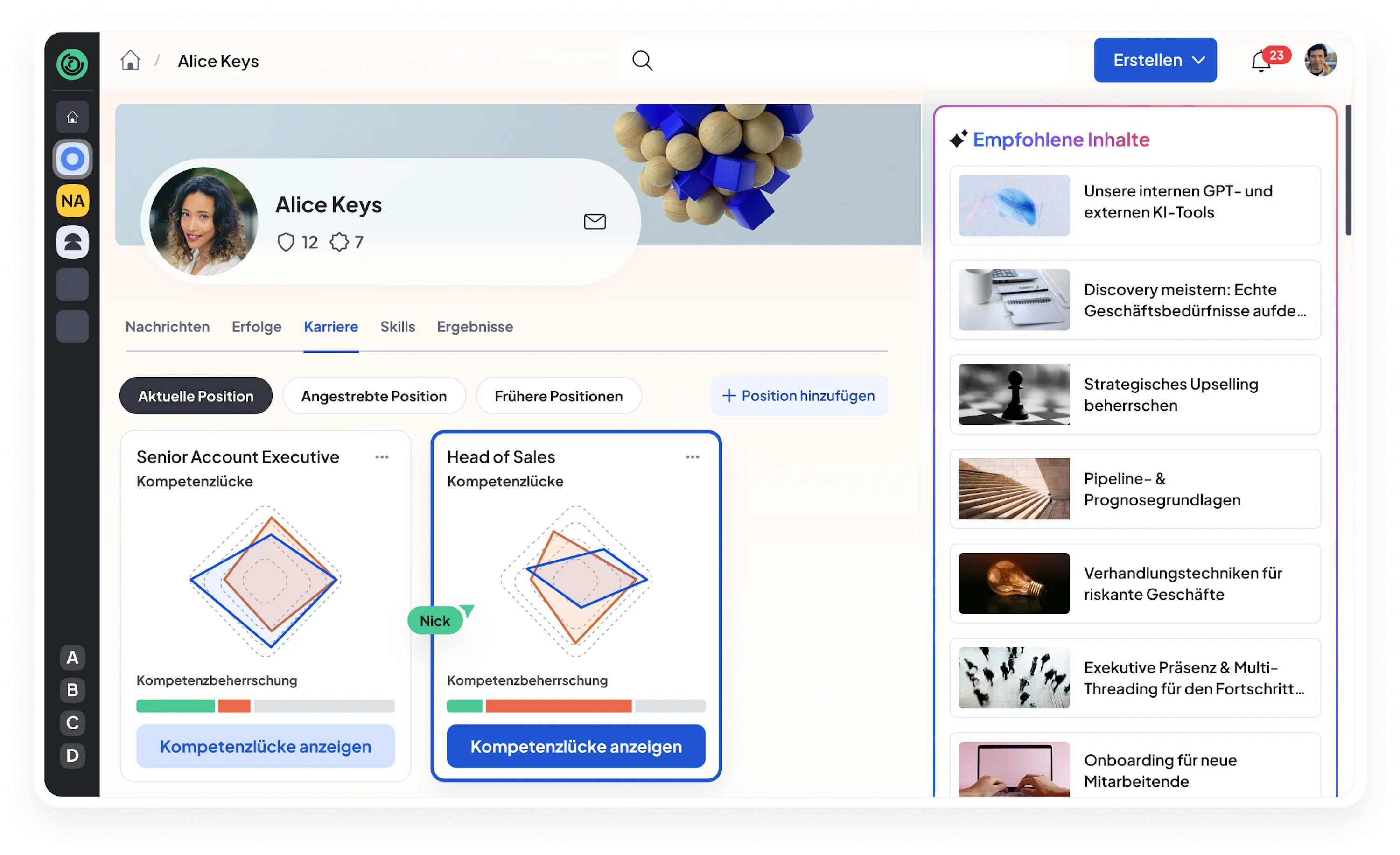 Mit einem Klick können Sie Lernenden einen klaren Überblick über das erforderliche Kompetenzprofil für ihre aktuelle Rolle geben. Manager können individuelle oder teamweite Kompetenzlücken einsehen, um ihre Coaching- und Schulungsmaßnahmen anzupassen.