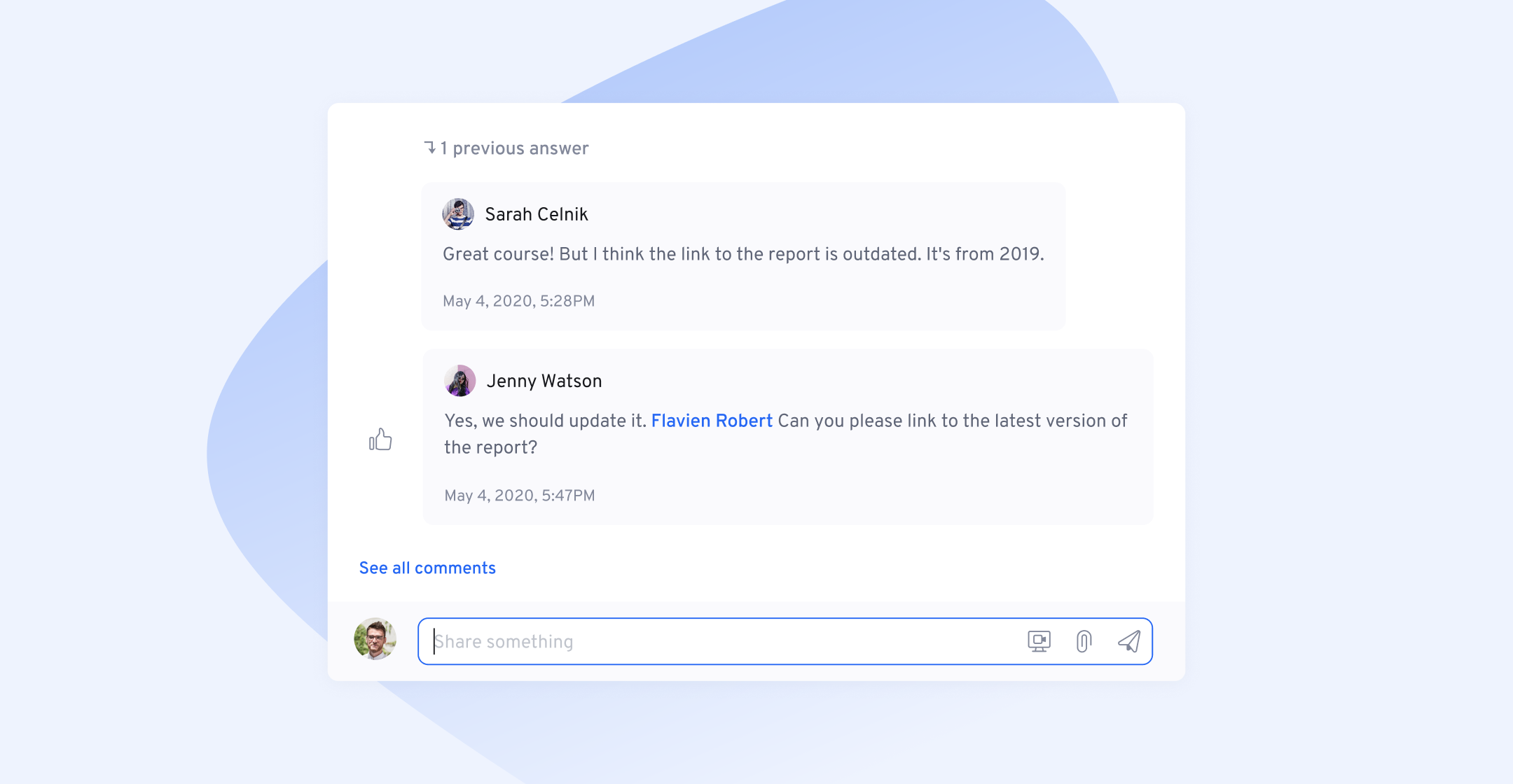 Notre forum de discussion motive vos équipes à finir leurs modules de formation et à retenir plus d'informations. C’est là où la magie du collaborative learning opère : les apprenants peuvent désormais participer à l'élaboration du contenu de formation et échanger avec des experts.