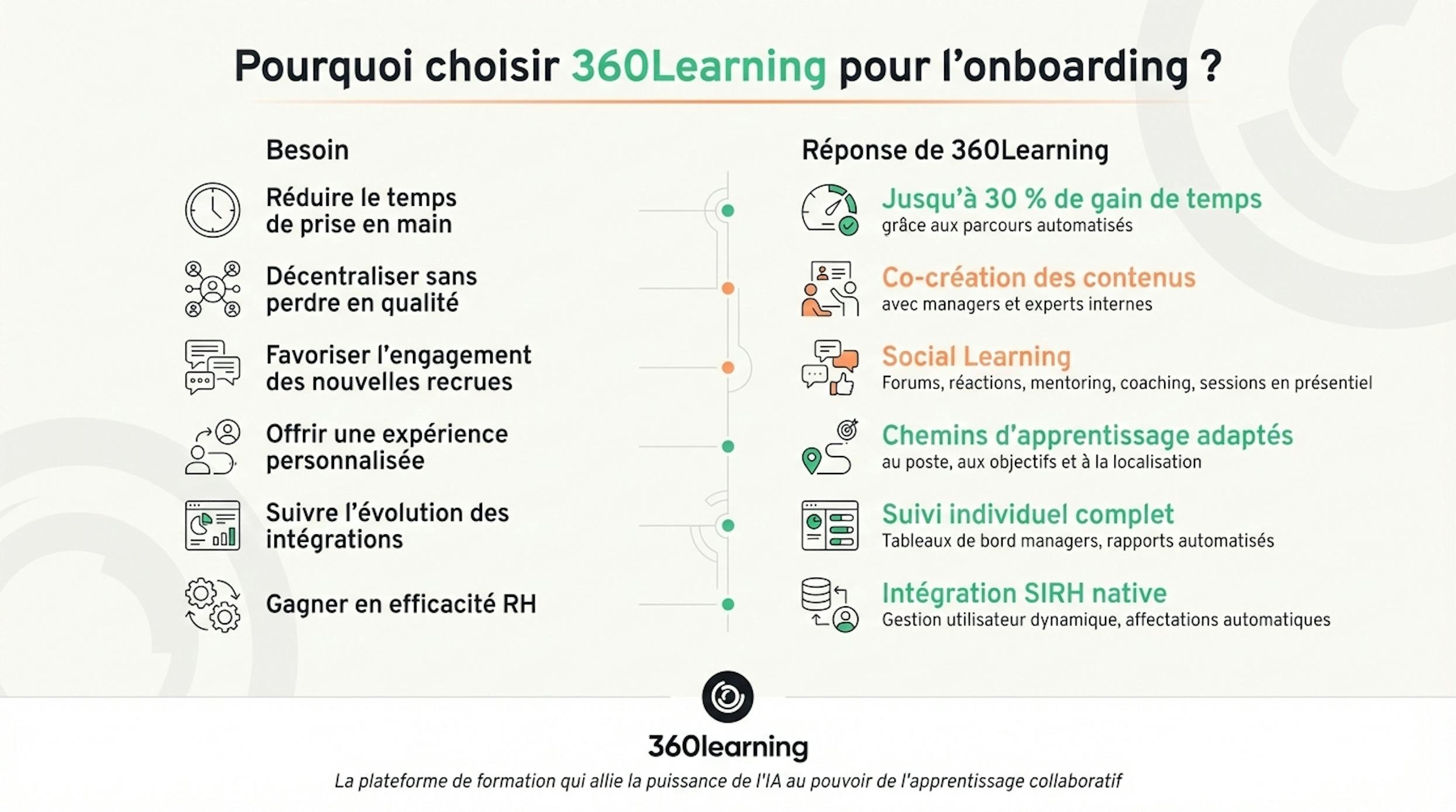 L’onboarding est au cœur de sa proposition de valeur. Grâce à une approche fondée sur la co-création des contenus, les intégrations SIRH et des parcours intelligents adaptés aux rôles, 360Learning permet aux entreprises de gagner du temps, de fluidifier l’expérience collaborateur et de renforcer l’engagement dès le premier jour.
