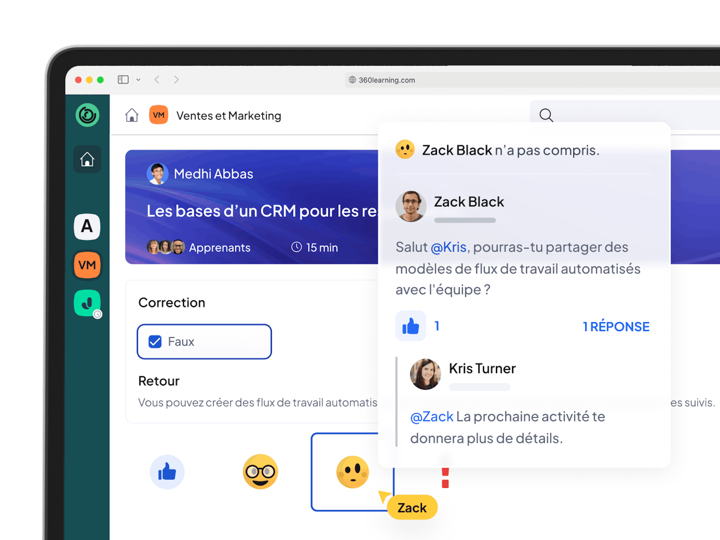 Un exemple concret : Plutôt que d’imposer une évaluation du pitch commercial dans un module, un(e) Sales Enablement Manager peut donner aux commerciaux la possibilité de signaler des problèmes rencontrés pour leur proposer des solutions. Il/elle peut ensuite créer des parcours de formation offrant les conseils nécessaires pour s'améliorer.