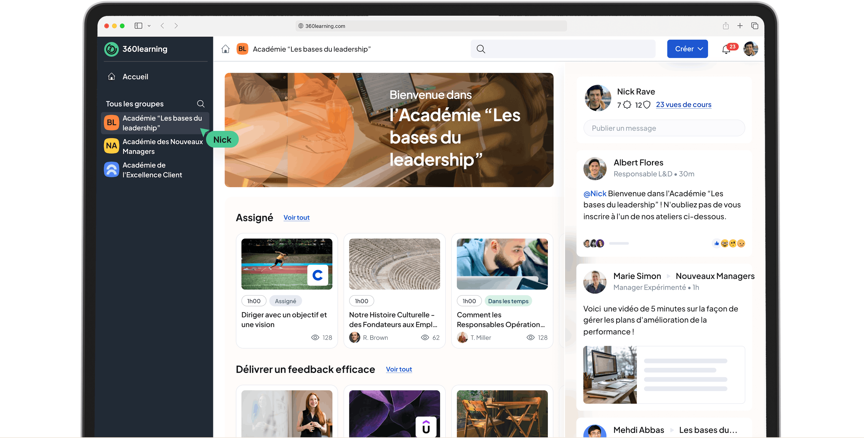 Lancez des Académies collaboratives en quelques minutes pour créer des communautés d’apprentissage par rôle, fonction ou site. Sélectionnez des cours pertinents, encouragez le partage de connaissances entre pairs et développez une culture d’apprentissage continu.