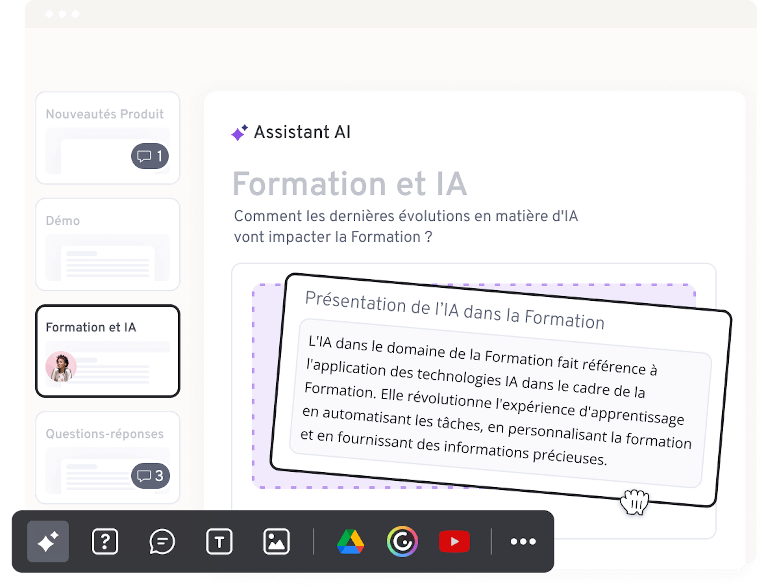 Laissez-vous guider par la création de cours assistée par l'IA pour ne plus partir d’une feuille blanche. Simplifiez la création de contenus de formation pour inciter au partage de connaissances et conserver vos savoir-faire.