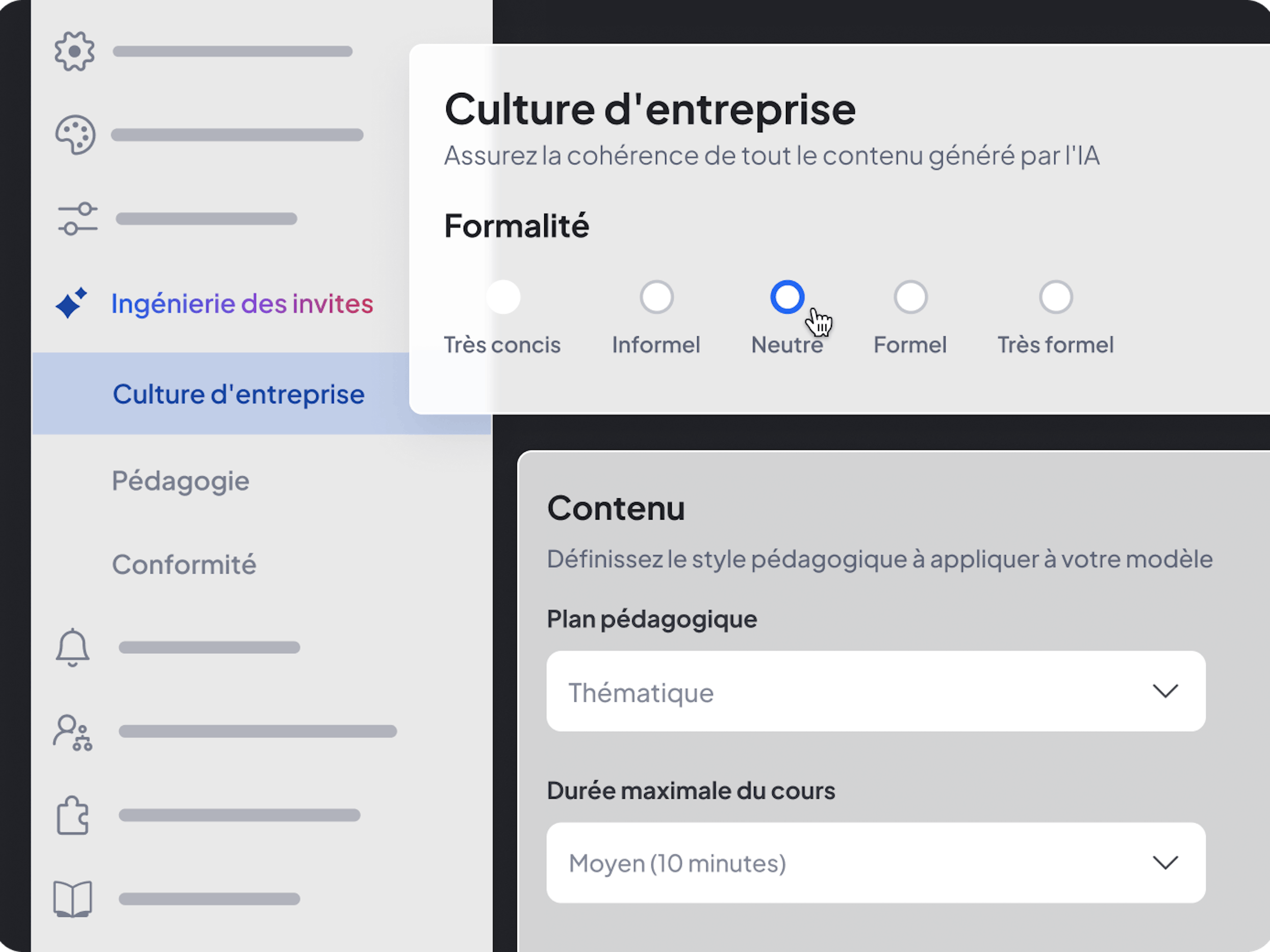 Confiez la création de contenu à des experts en toute confiance grâce à des prompts qui intègrent vos objectifs pédagogiques et votre politique d’entreprise.