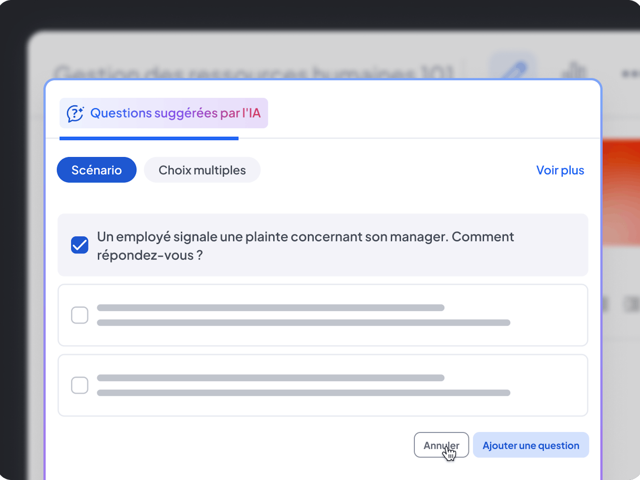 Préparez vos apprenants aux défis du quotidien. Maximisez l’engagement et la montée en compétences avec des questions scénarisées générées par l’IA, proches des défis réels.