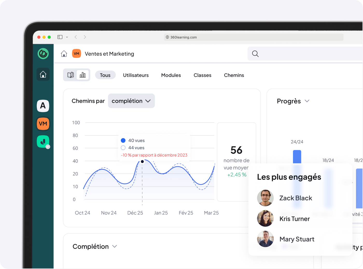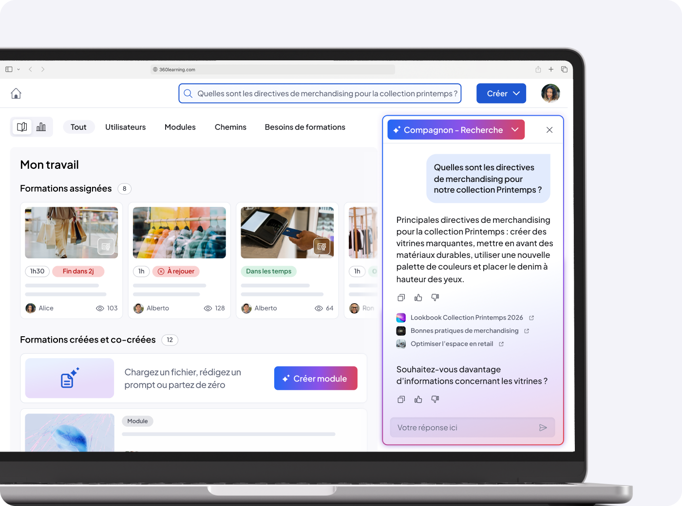 Peur de perdre le contrôle en développant la formation ? N'ayez crainte. Avec le LMS 360Learning, et ses prompts personnalisés, simplifiez la création de formations. Des échéances aux attributions, en passant par les notifications, gardez un œil sur tout grâce à notre puissant LMS boosté par l'intelligence artificielle.