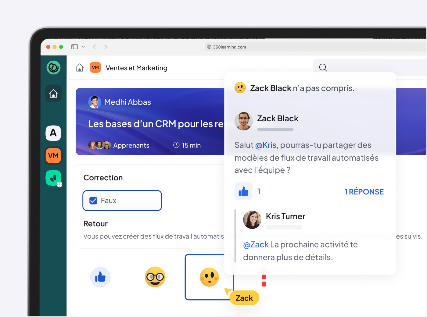 Stimulez l’engagement et augmentez les taux de complétion grâce à l’apprentissage collaboratif. Donnez aux apprenants les moyens d’interagir entre eux et permettez aux experts de contribuer, pour des expériences d’apprentissage plus impactantes.