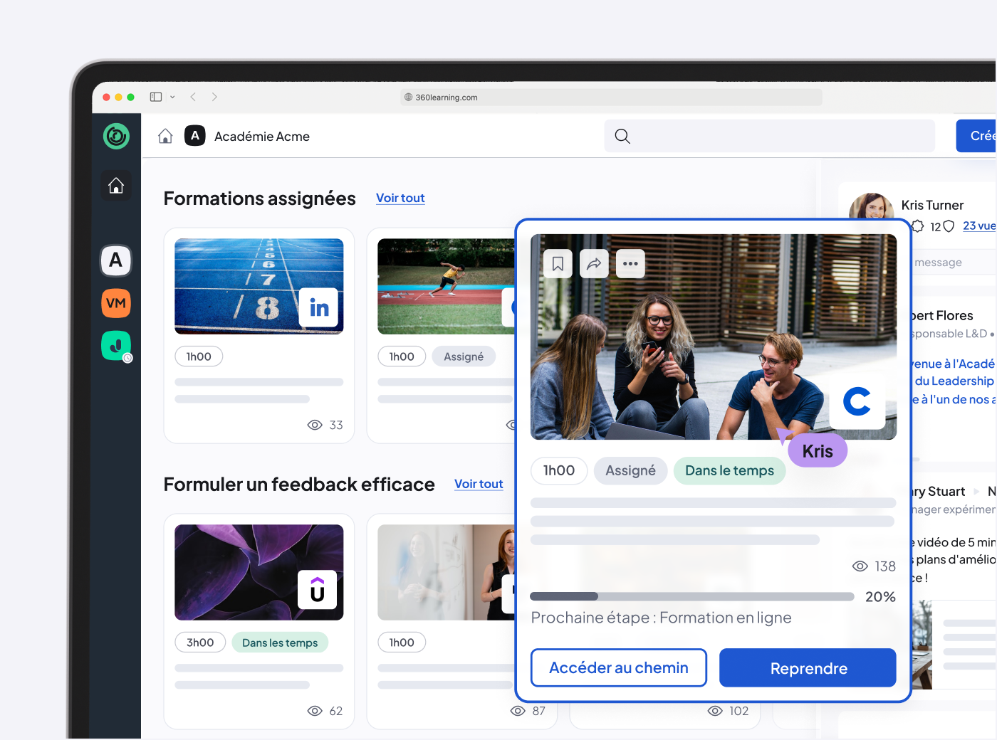 Créez de véritables communautés d’apprentissage grâce à des académies internes dédiées. Rassemblez les contenus pertinents, encouragez le partage entre pairs et cultivez une dynamique de formation continue dans toute l’organisation.