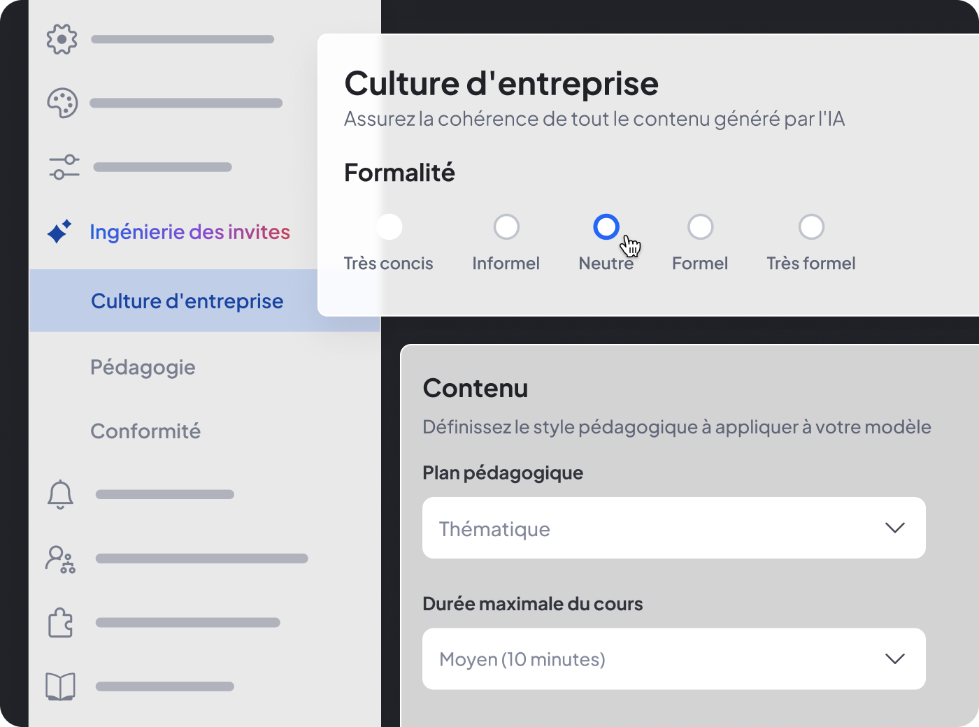 Confiez la création de contenu à des experts en toute confiance grâce à des prompts qui intègrent vos objectifs pédagogiques et votre politique d’entreprise.