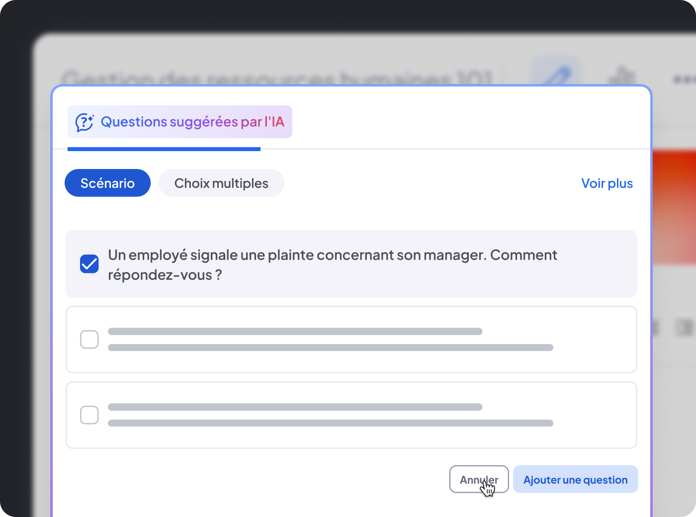 Préparez vos apprenants aux défis du quotidien. Maximisez l’engagement et la montée en compétences avec des questions scénarisées générées par l’IA, proches des défis réels.