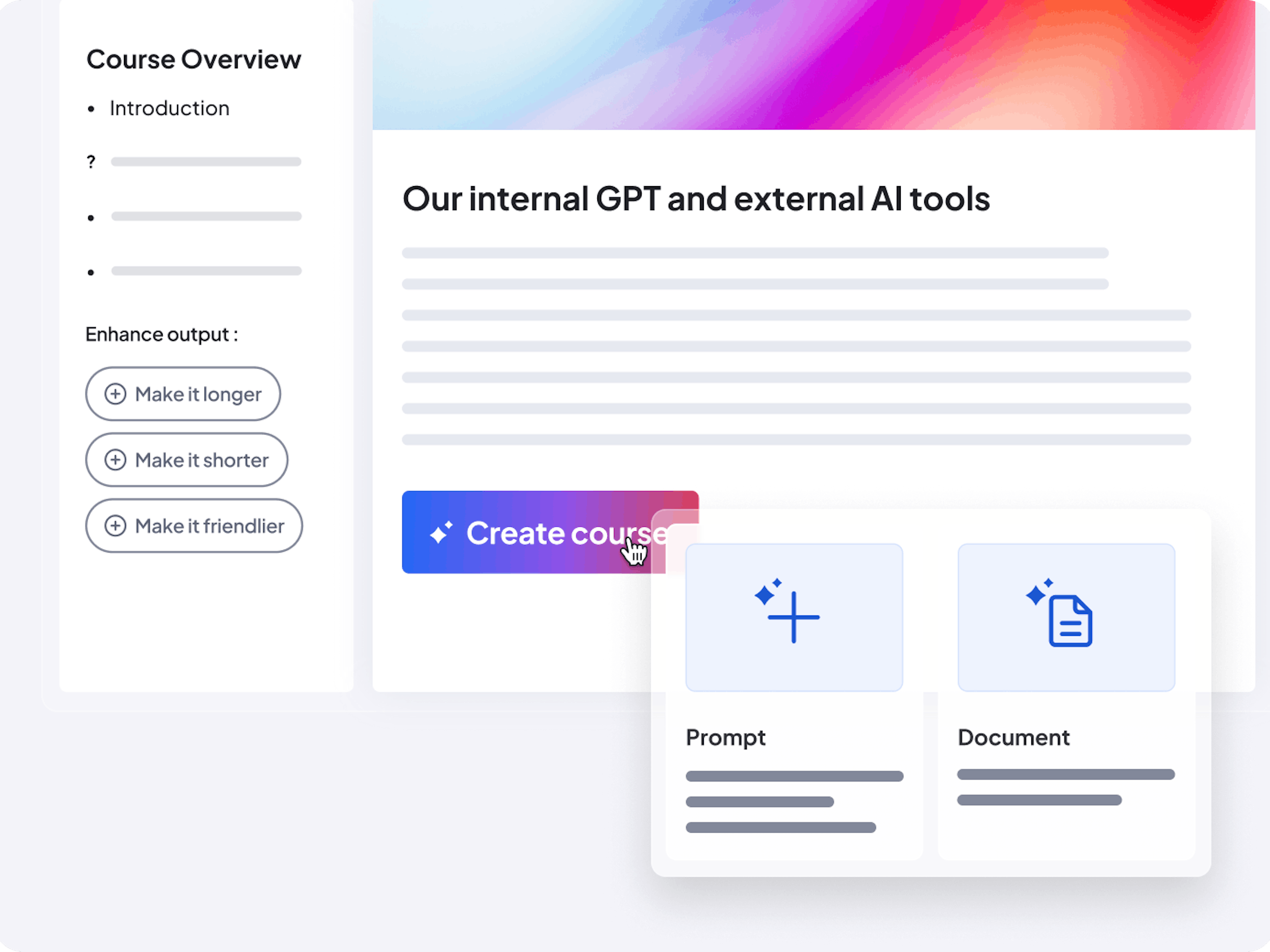 Tired of the lack of control and consistency in course development? Tap into your experts to create relevant training with customizable L&D-controlled AI prompts and template.