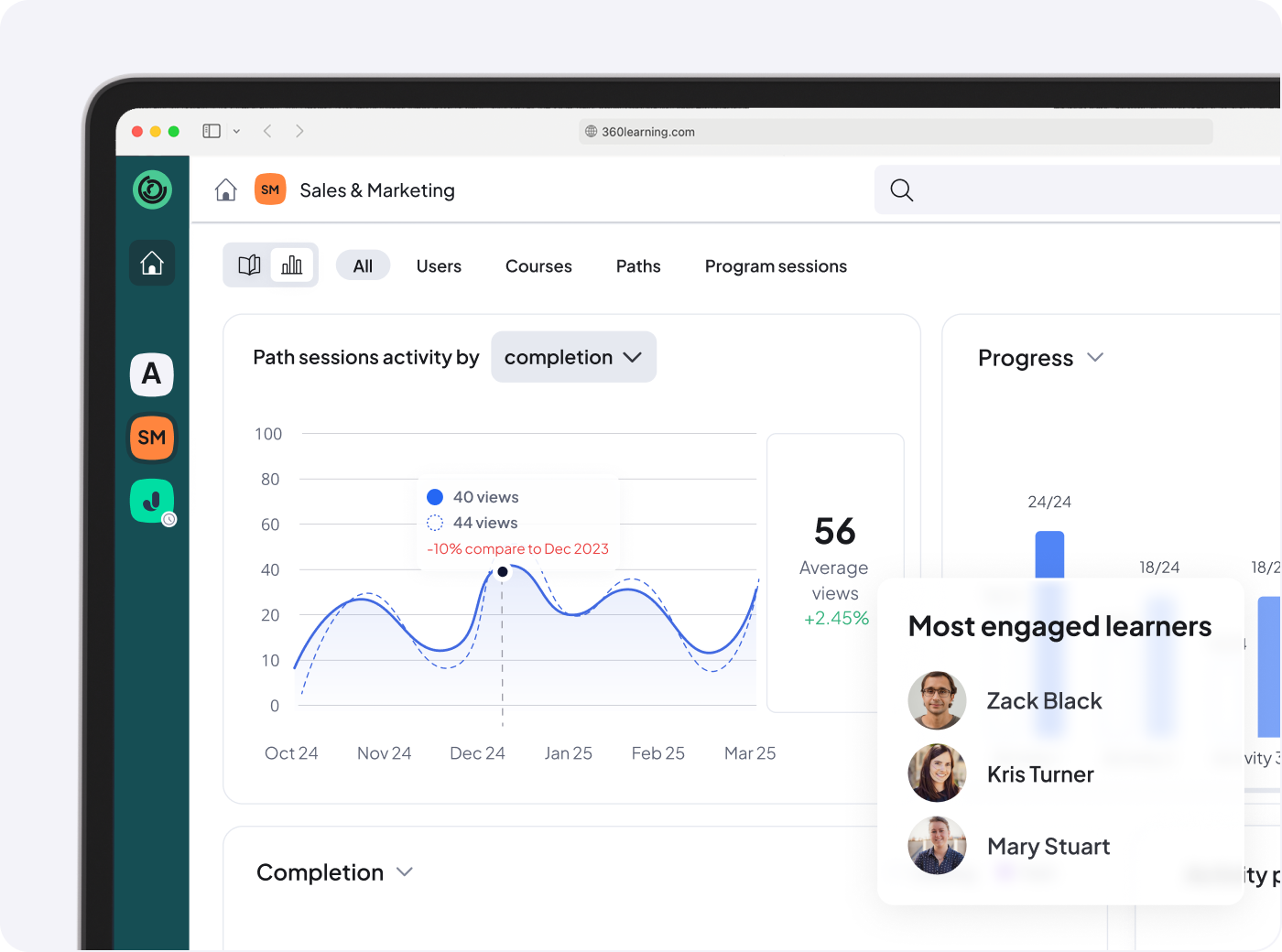 Struggling to show your learning strategy’s business impact? View digestible dashboards with actionable data to track learners, measure success, and make adjustments.