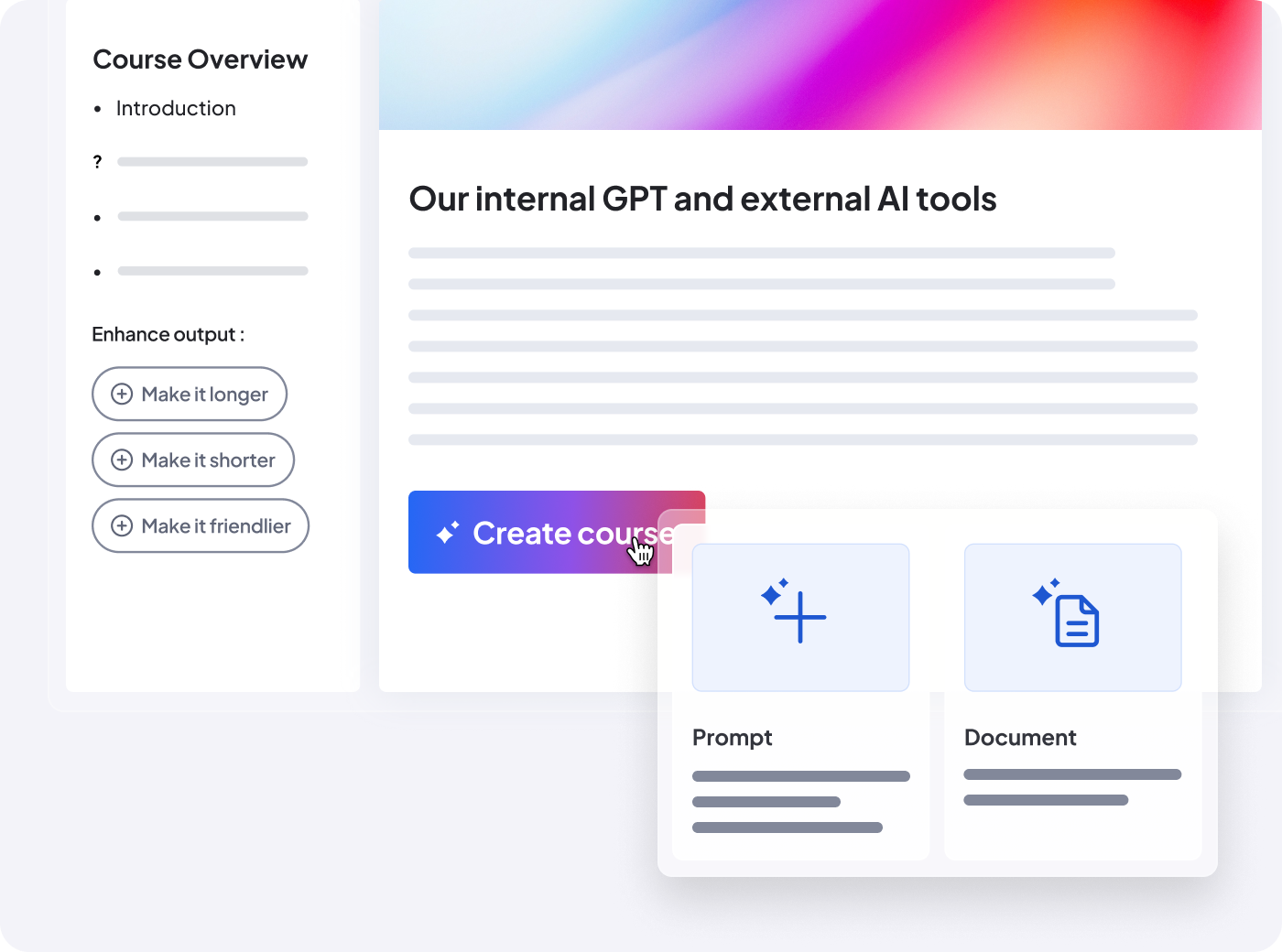 Tired of the lack of control and consistency in course development? Tap into your experts to create relevant training with customizable L&D-controlled AI prompts and template.