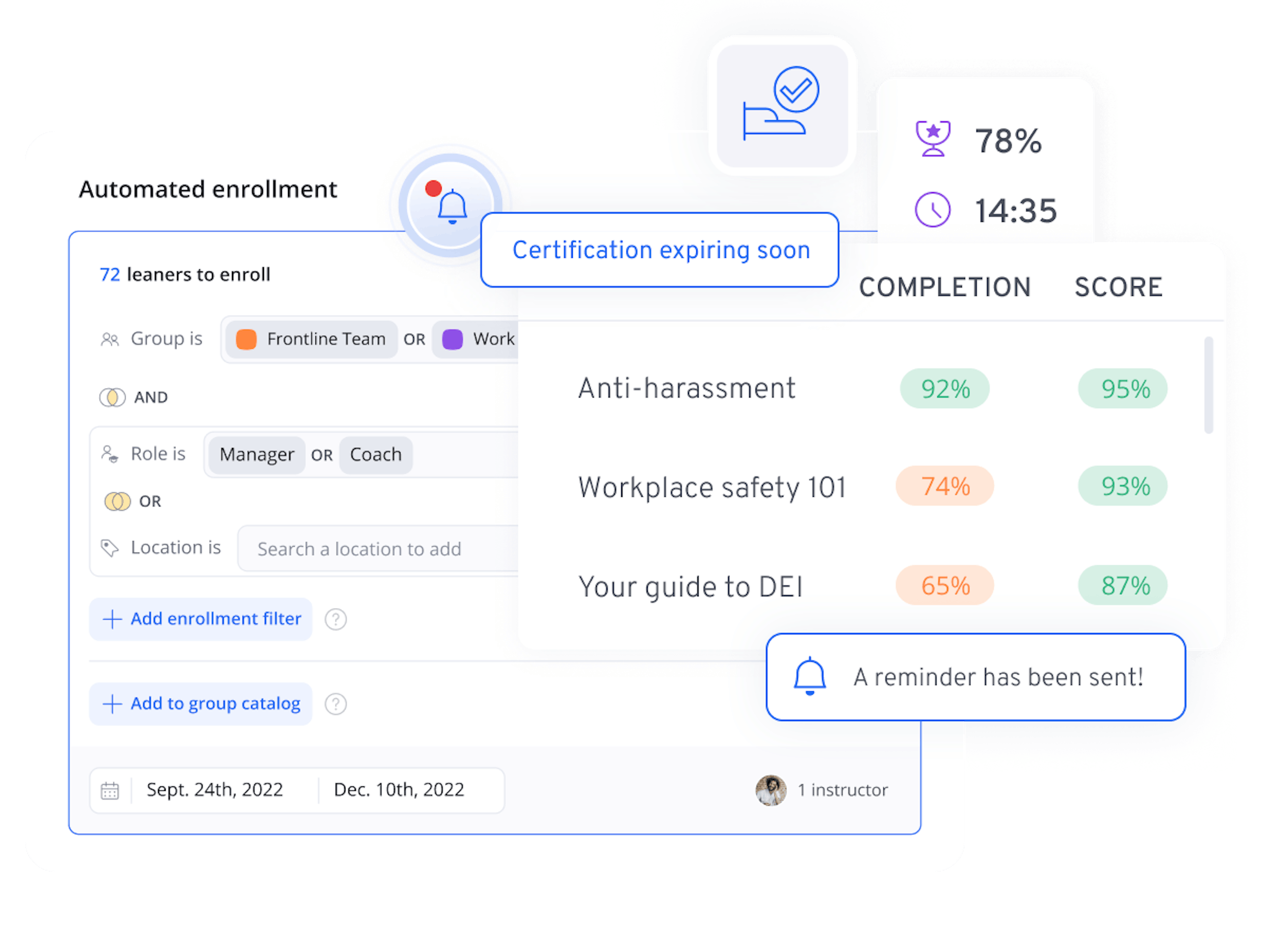 Automate and manage mandatory training and retraining. Orchestrate compliance training end-to-end, with automated enrollment, reminder notifications, certificate expiration alerts and comprehensive audit-proof reporting.