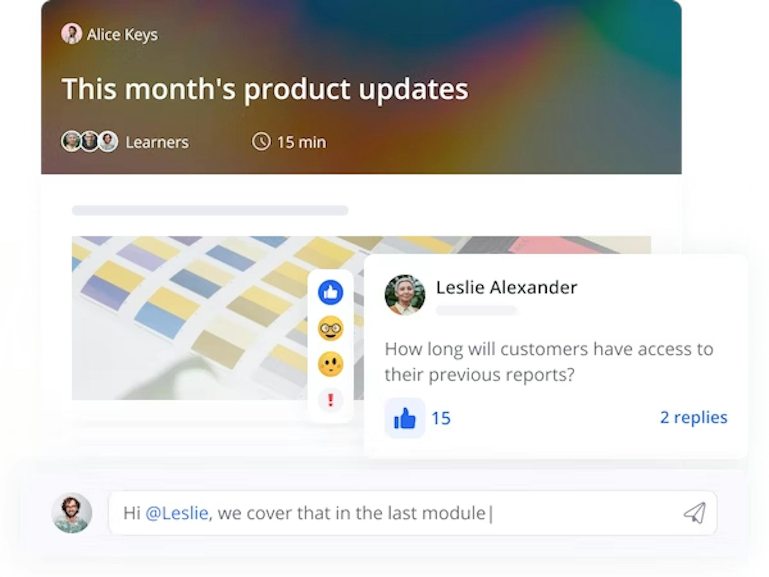 Keep courses fresh with real-time feedback from learners. See what they like and don't like with in-course commenting, threaded Q&As with upvoting, and learner relevance scoring, so you and your team can optimise course content and charge toward 91% completion rates.