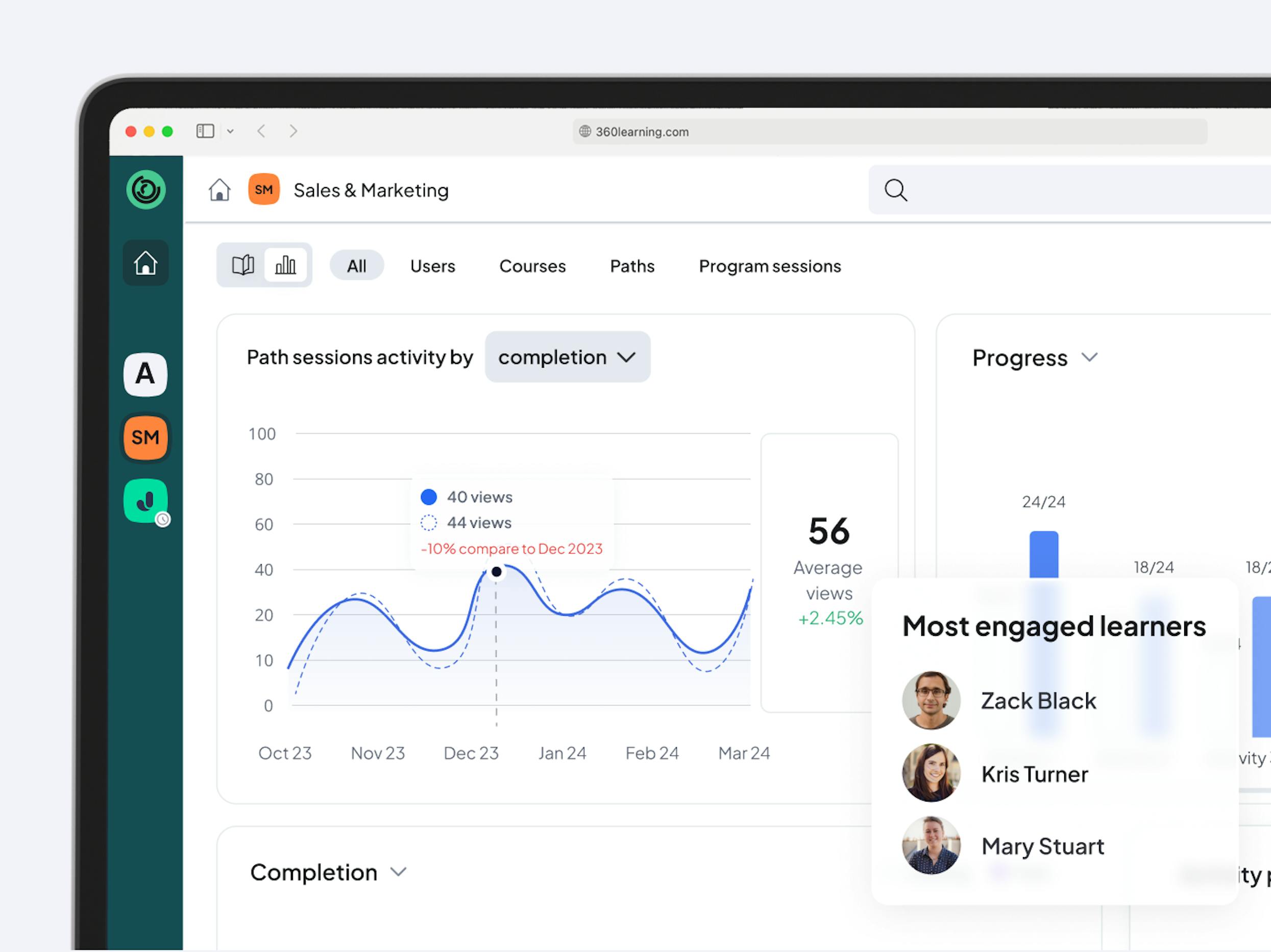 Aggregate, filter, sort, create a custom view, and download stats related to paths sessions. Drill-down to access individual learner data, or gather data at the group level for valuable insights.