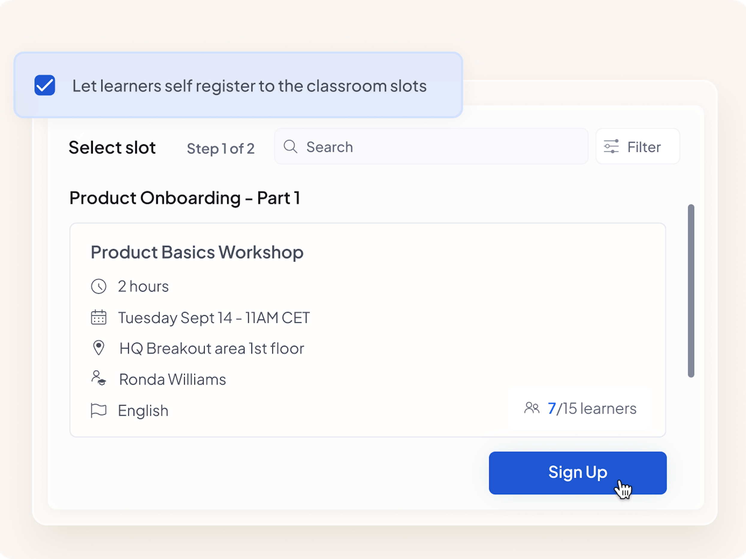 Register learners yourself. Let learners self-register, including from mobile. Or activate auto-registration, and let the platform register learners to the next open training.