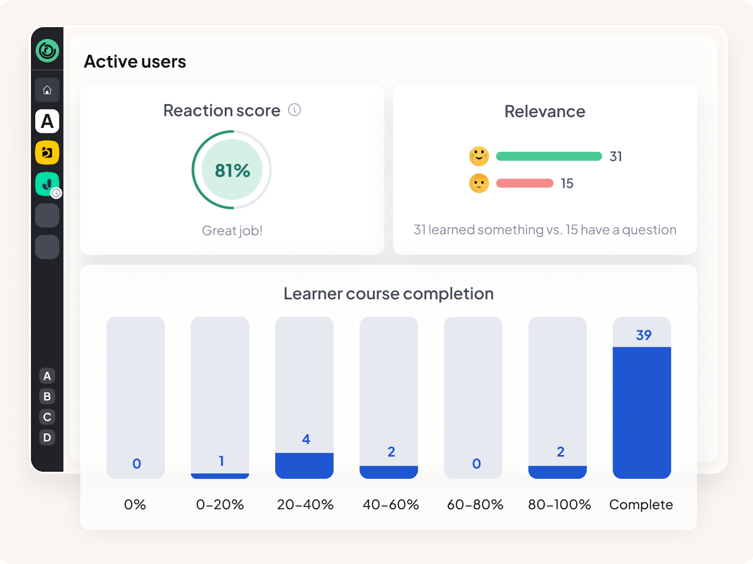 Struggling to show your learning strategy’s business impact? View digestible dashboards with actionable data to track learners, measure success, and make adjustments.