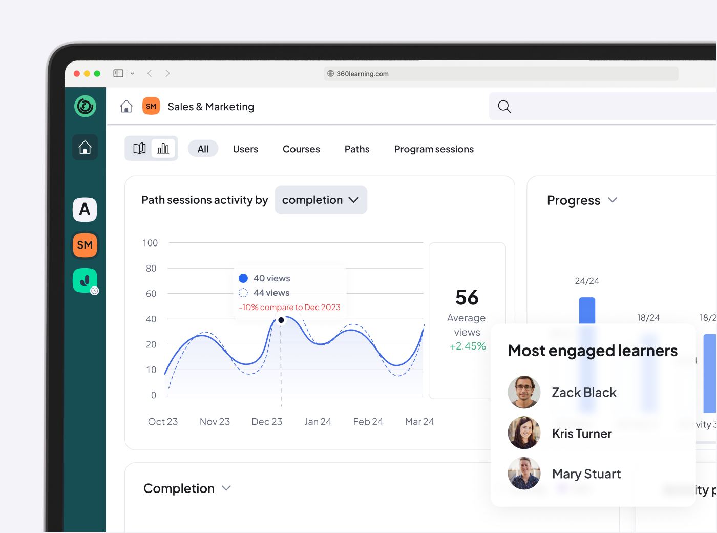 Aggregate, filter, sort, create a custom view, and download stats related to paths sessions. Drill-down to access individual learner data, or gather data at the group level for valuable insights.