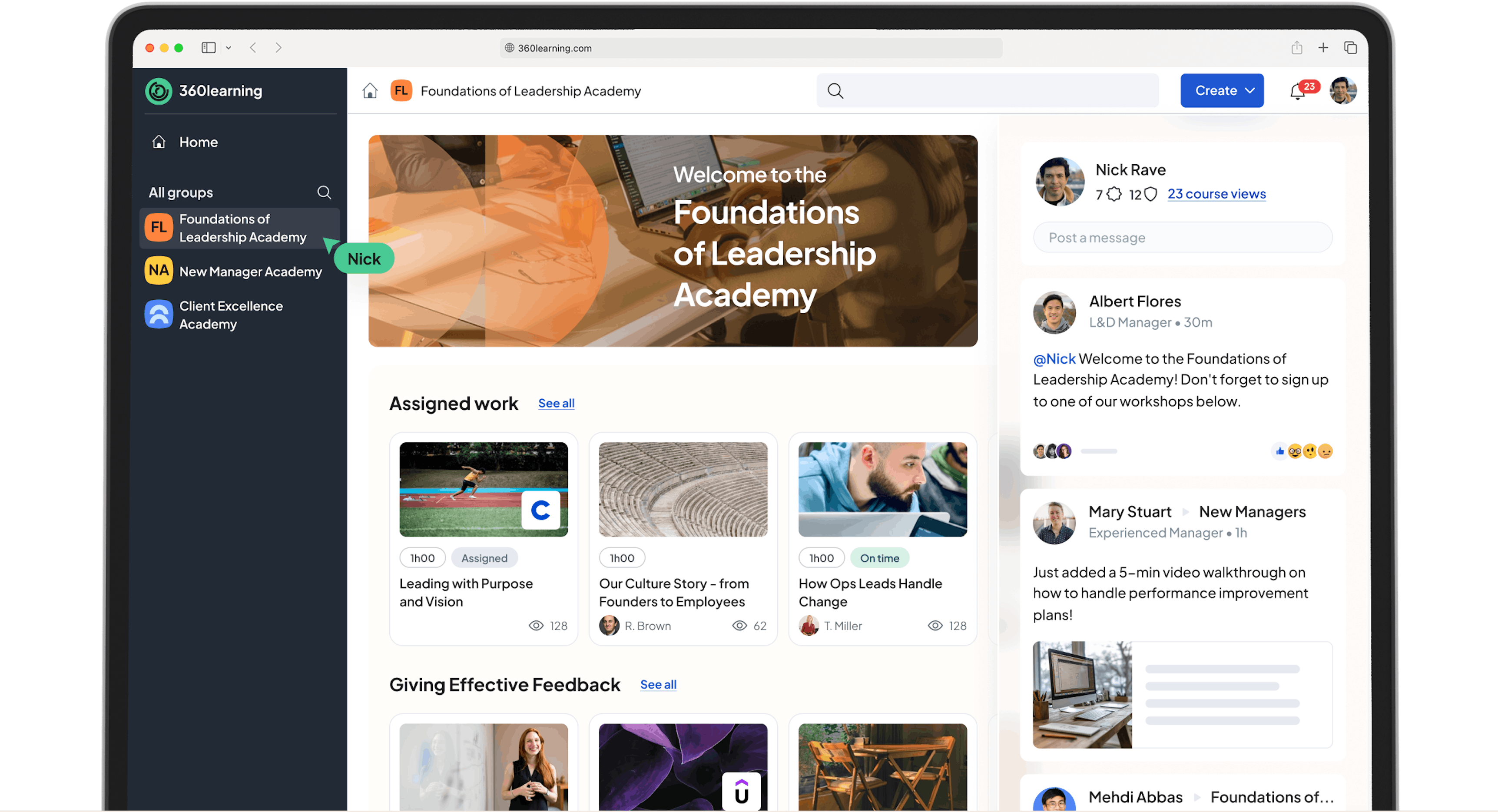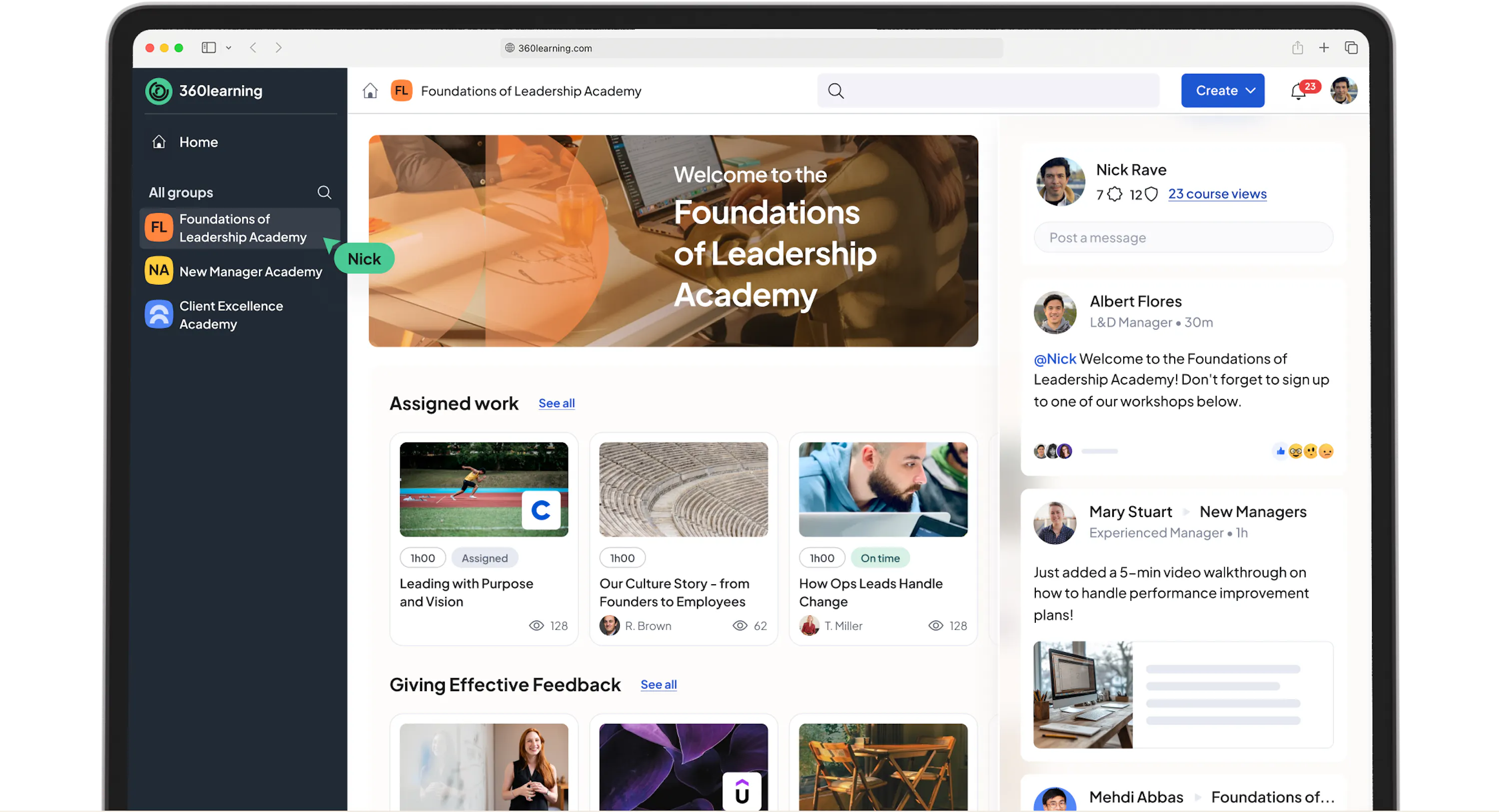 Launch collaborative Academies in minutes to foster communities of practice by role, function or geography. Curate relevant courses, encourage peer-to-peer knowledge sharing, and drive a culture of continuous learning.